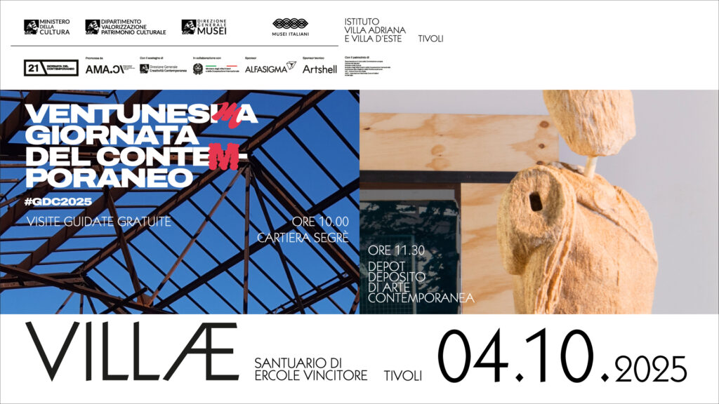 Sabato 4 ottobre 2025 l’Istituto Villa Adriana e Villa d’Este – VILLÆ celebra la 21ª Giornata del Contemporaneo all’interno del suggestivo complesso del Santuario di Ercole Vincitore. La Giornata del Contemporaneo è promossa da AMACI con il sostegno della Direzione Generale Creatività Contemporanea del Ministero della Cultura e in collaborazione con la Direzione Generale per la diplomazia pubblica e culturale del Ministero degli Affari Esteri e della Cooperazione Internazionale.